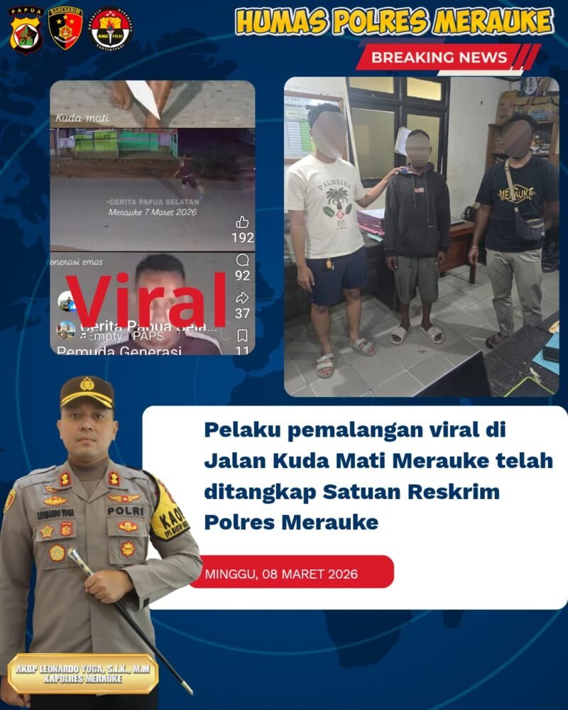 “Kami telah mengamankan pelaku pemalangan jalan yang sempat viral di Jalan Kuda Mati. Saat ini yang bersangkutan sudah berada di Rutan Polres Merauke untuk menjalani proses hukum lebih lanjut,” ujar Kasat Reskrim.